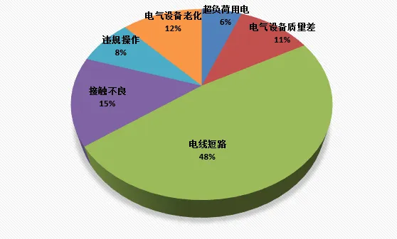 通过对近五年来电气火灾事故分析发现,主要有电线短路、过负荷用电、接触不良等几种原因导致事故发生,占比分别为: