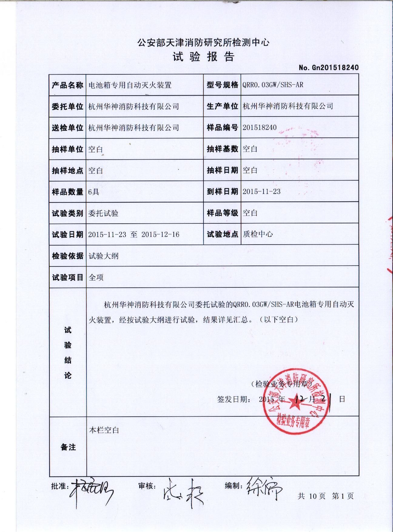 根据国家相关产品技术标准及行业要求,“恒神”电池箱专用自动灭火装置于2012年委托公安部天津消防研究所检测中心进行了1:1电池箱灭火试验。