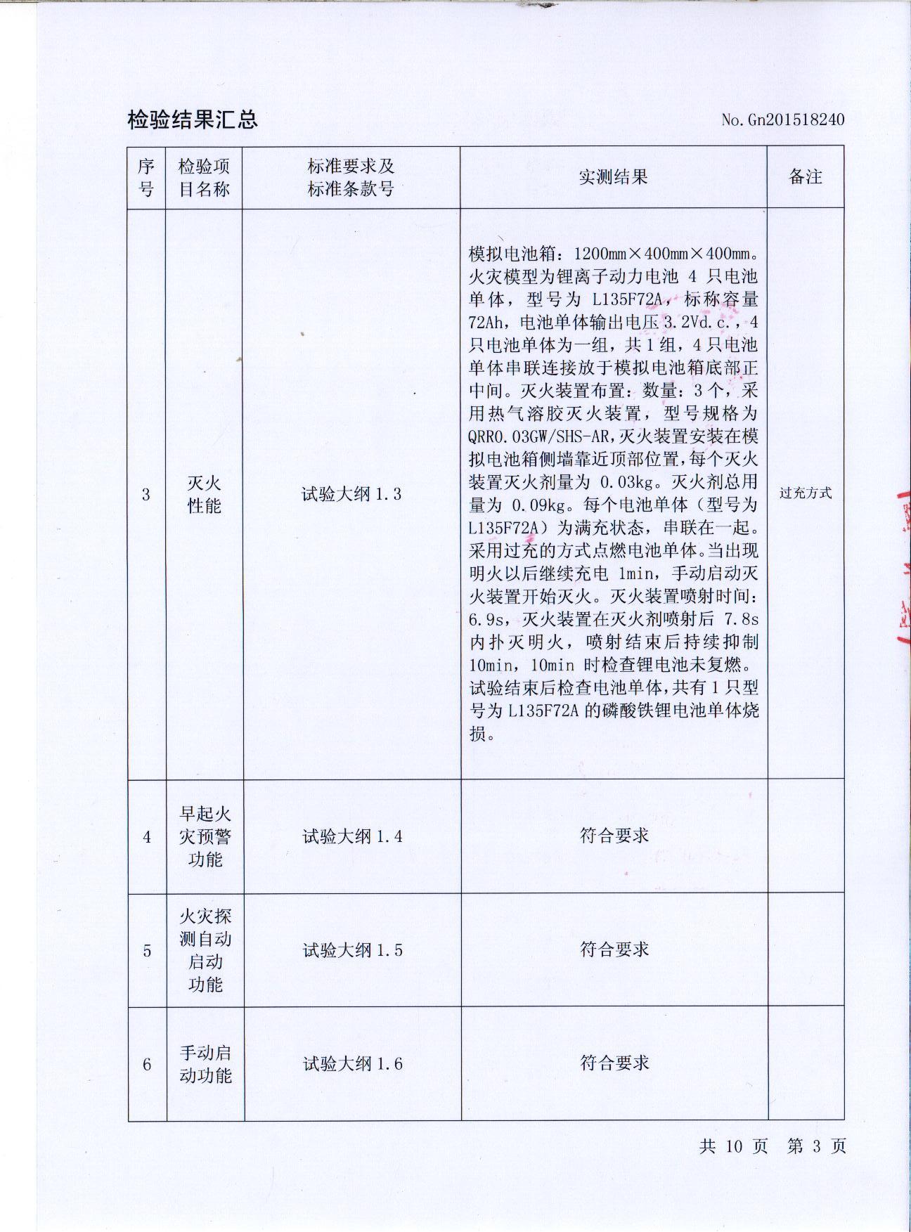 根据1:1模拟电池箱电池成组灭火试验测试,电池箱专用自动灭火装置在外观与标志、喷射时间、灭火性能、早期火警预警功能、火灾探测自动启动功能、手动启动功能等方面的功能设定均符合测试大纲要求,达到国家要求的技术标准。
