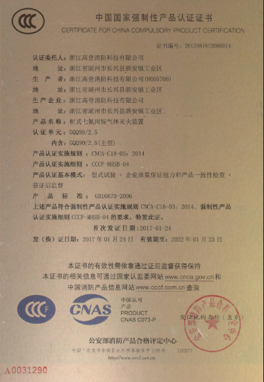 2017年1月24日,公司七氟丙烷产品(柜式七氟丙烷气体灭火装置、七氟丙烷灭火设备)经过公安消防部门的层层验收,喜获“3C”证书。